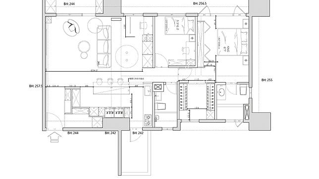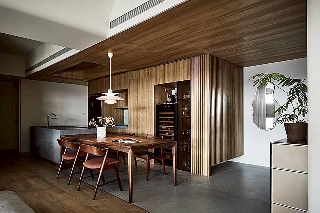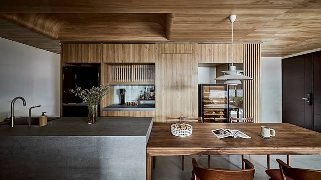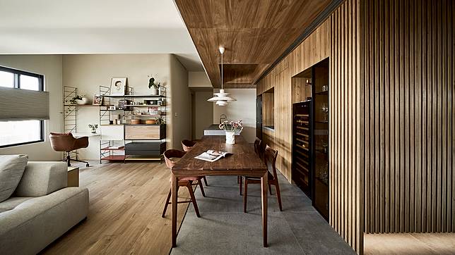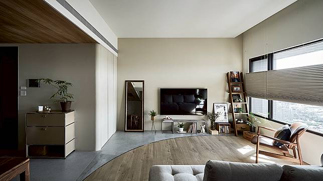 熱愛生活、享受品味的屋主夫妻,同時也喜歡在家料理與小酌,透過熱炒區獨立分隔,具備中島與餐桌的開放式輕食區,不僅將冰箱、餐備櫃、紅酒櫃、展示櫃等功能區域齊備佈局,化身空間美味中心,更以此區的溫潤木紋與樸質灰調為主風格開展。其中大量的木質延伸至天花,並呼應同樣木感的客廳地坪拋弧線;而低調的灰樸用色則從玄關入門,直至輕食料理區地面與客廳電視櫃前地坪;不同材質採曲線劃分銜接,柔和的拋弧線條連動圓弧天花,弱化了原本客廳突兀的橫樑牆角所產生的零碎視覺,清雅的律動美學亦打破空間框架,流暢穿梭於空間之中,交替出內蘊而生的優美細節。同時也讓每一件家具、擺件,以及搭配的每一道線條與切面,完美地訴說著一家人自在且充滿品味的居家故事,為屋主重視自然和生活感的初願,於此得以欣然實現。
