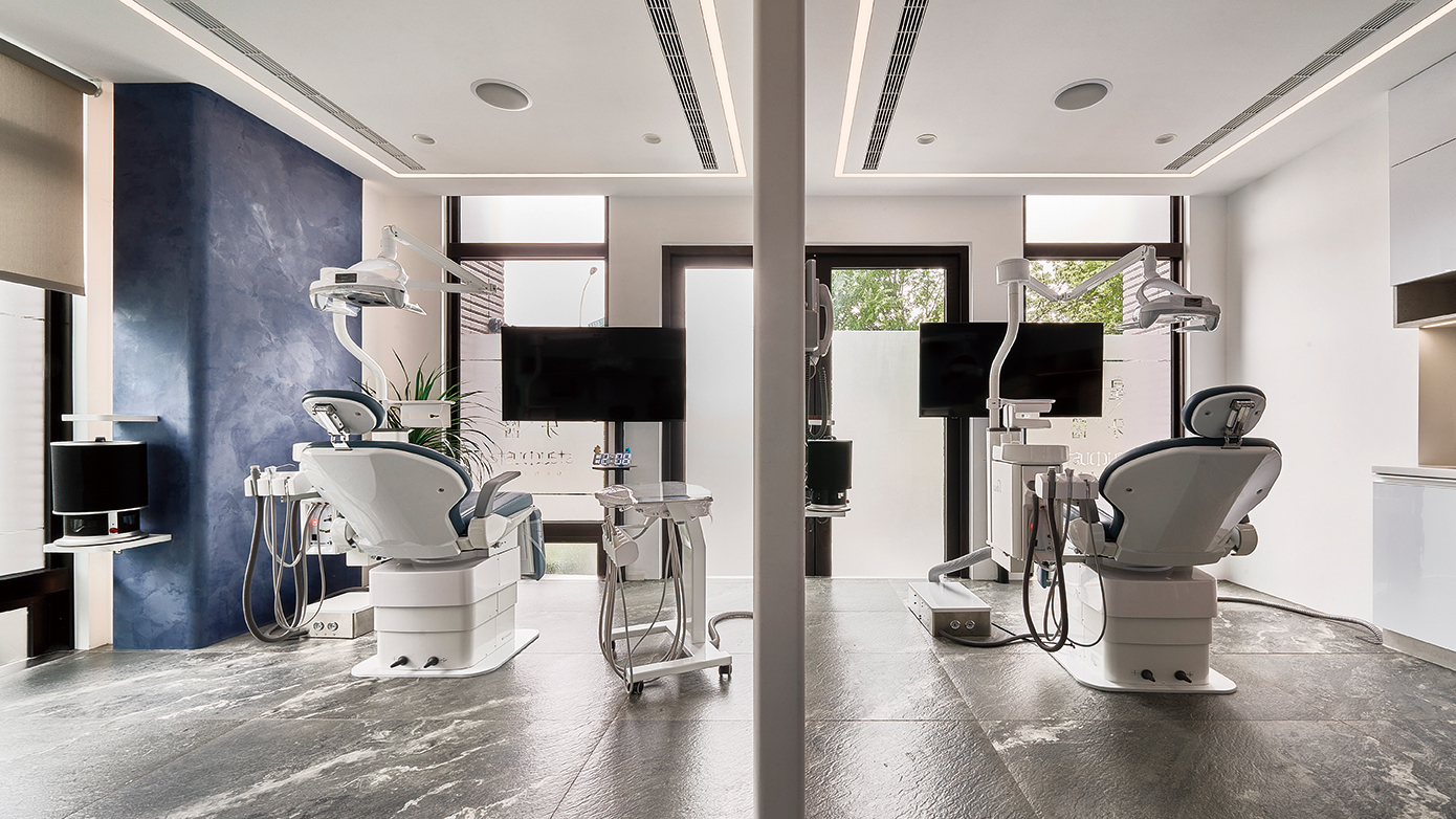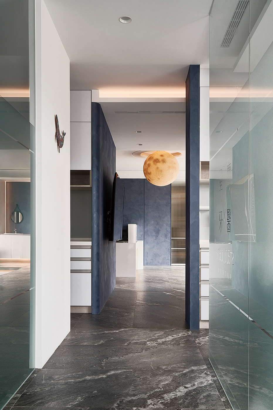 候診區主燈選擇了星球圓燈,牆面的層板則展示了醫師收藏的星座裝飾、繪畫作品,甚至在診間,也設置了懸浮星球燈與德國空氣淨化系統,交織成一場低調又靜謐的詩意演出,每一抹藍、每一束光,都演繹著「星塵」的理念:而每一個呼吸,都能享受潔淨無異味的空氣,專業也可以溫暖,科技與藝術始終並行不悖。讓星塵牙醫不僅是醫療場所,更是一個可以靜謐從容、適合安心微笑的湛藍宇宙。