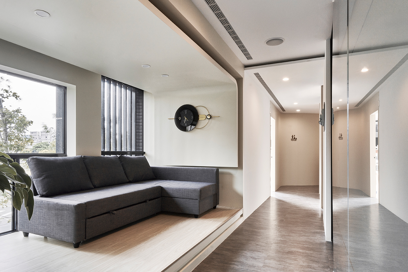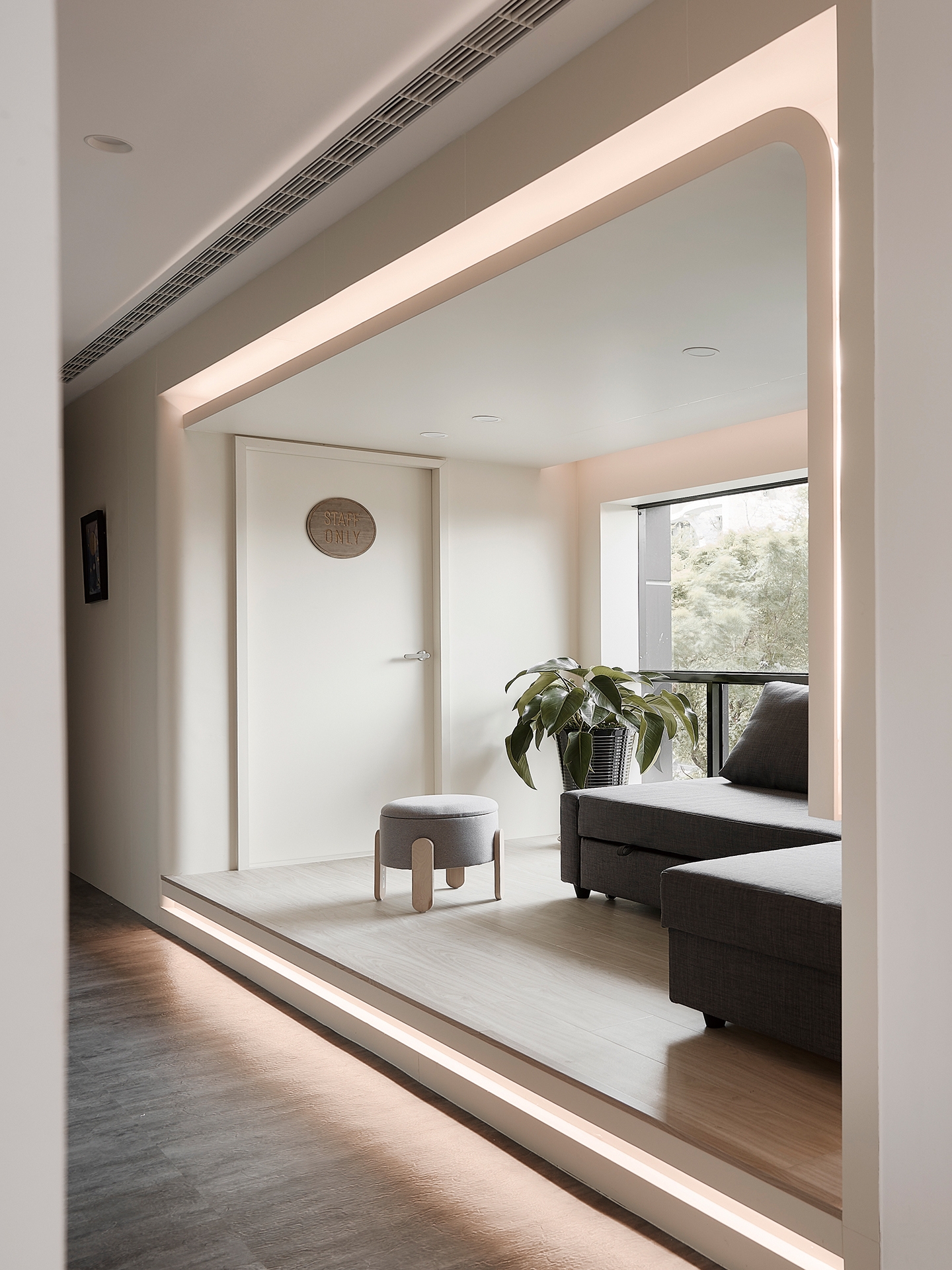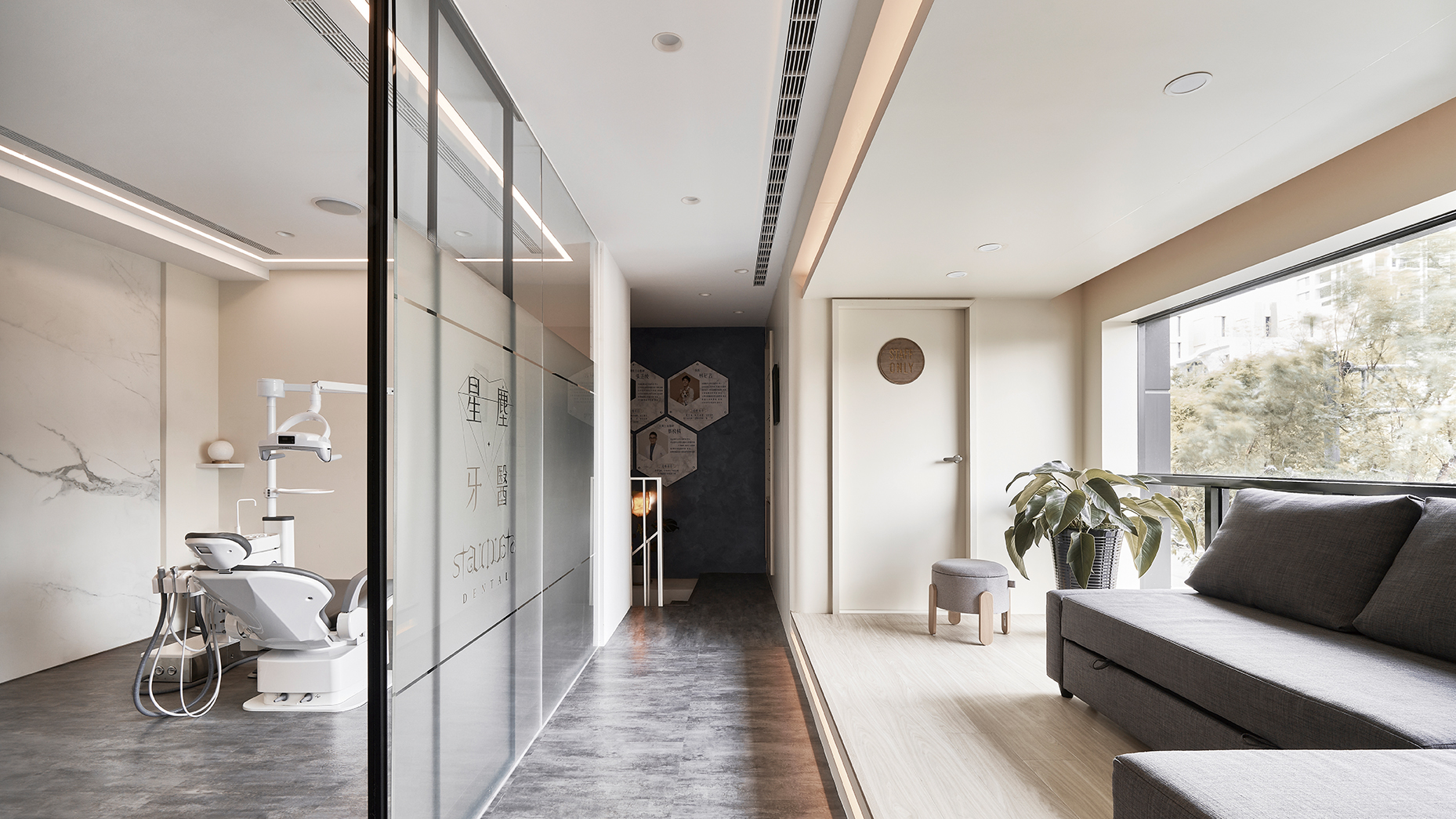 地坪採用合金高架地板,在統一高度的同時,更隱藏牙醫設備所需的繁複管線,讓表面乾淨俐落、專業簡潔,功能與美感相得益彰。入門處右側則規劃為諮詢與衛教區,以長虹玻璃門片作為輕盈的分隔;左側則為X 光室與診療空間,動線的規劃簡潔俐落,對工作人員或者患者都相當輕鬆、便利與流暢。這樣的安排,在有限的坪數中爭取到最具秩序感也最開闊的視覺感,兼顧機能與氛圍,打造能舒適候診、安心就診的醫療環境。