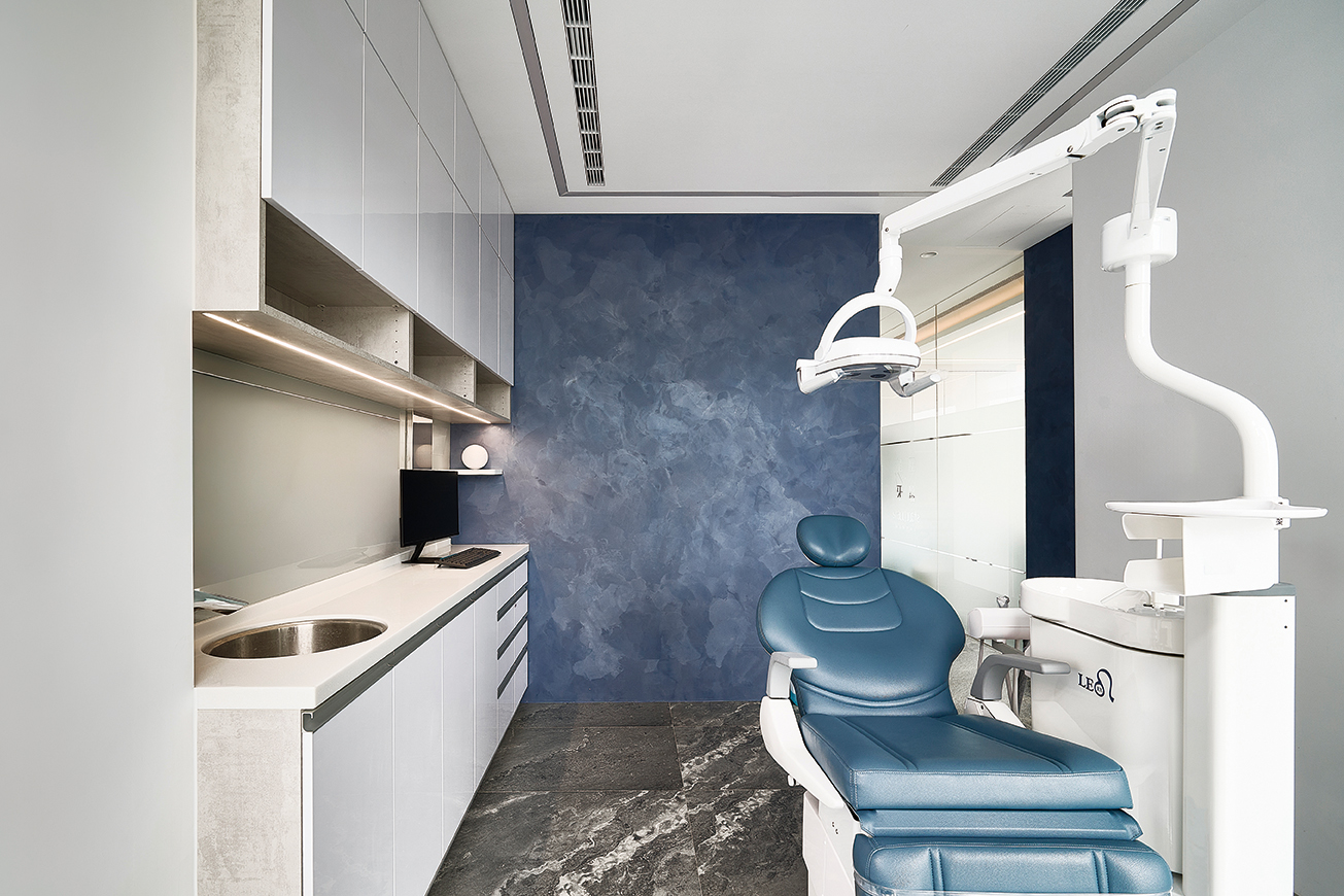 與一般診所最大的不同,在於星塵牙醫的局部牆面,和院所名稱相呼應,塗布了令人目眩神迷的藍,表現出有如星空般的深邃迷離;這充滿層次的藍,是設計師經過多次的嘗試,從深藍到海洋藍,再於局部加深或稍減明亮度與色階,型塑夜空的閃爍與層次。為了避免深色吸光造成夜晚視覺上過暗的效果,特別加入白色漸層,輕輕描繪出雲氣與星光的閃耀與晃動,讓牆面在光影變化中呈現出柔和流動。