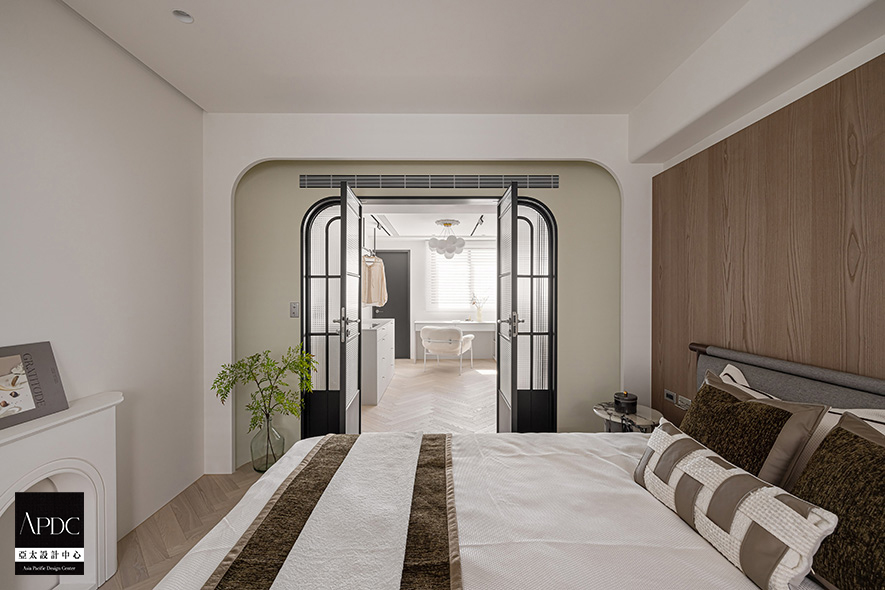 ▲睡眠區及更衣室交界處設置黑色鐵件拱形對開門,並巧妙運用原有門上大樑限制,將吊隱式冷氣出風口整合於樑下,在牆面色彩變化處延續拱形造型的木作設計,框出優美景深層次。