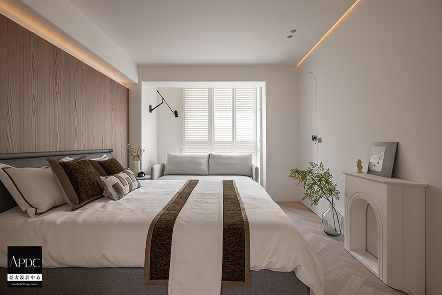 ▲主臥以淡色基調,佐以人字拼實木地板溫潤質感,搭配床頭的深色木皮作為視覺點綴,而床尾則設置壁爐造型夜燈,營造舒適溫馨的睡眠環境。