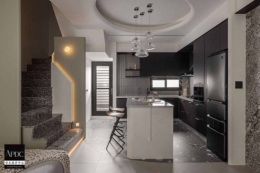 ▲與廚房黑色門板的俐落線條相互呼應,烹飪區選用淺灰色長型鐵道磚搭配黑色填縫劑,刻意凸顯磚材輪廓,營造精緻質感;中央的吧檯以圓潤線條感,柔和融入整體空間語境,既是料理工作檯,更作為家人情感交流的樞紐,親子互動在開放格局中自然發生。