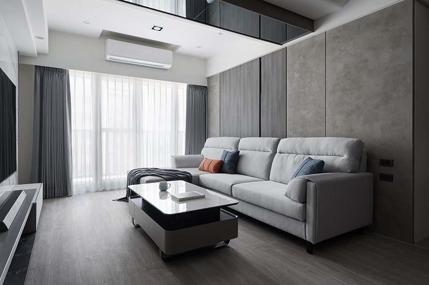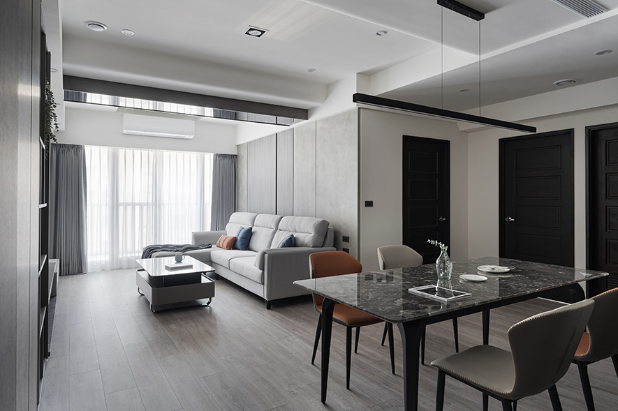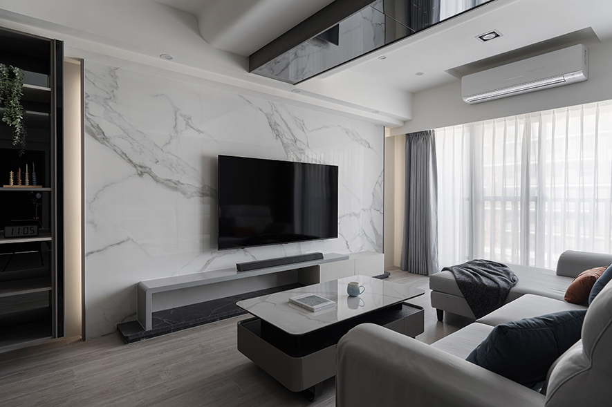 客廳以純淨的白色石紋電視牆為視覺焦點,其自然肌理與旁側深色木質展示櫃形成明暗對比,開放格架層層遞進,錯落陳列的精選物件為立面增添豐富層次;而天花板運用弧形包覆搭配鏡面反射,將原本橫亙的大樑化為優雅曲線,隱藏式燈帶勾勒出層次分明的光影輪廓,與落地窗透入的自然日光交相呼應,為灰色布質沙發及黑白茶几圍塑的會客區域凝結溫潤氣韻,醞釀沉穩內斂卻不失溫度的居家氛圍。