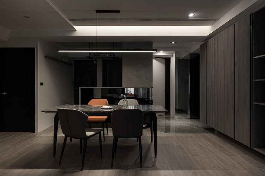 格局巧變,侷促盡褪,敞闊之境豁然鋪展。匠心獨具的亮面吧檯悠然佇立,虛實交輝間漫湧一室風雅氣韻,無聲銜接公領域的沉穩脈絡,旁側巧藏豐沛機能的電器與高昇櫃體,維繫畫面清朗從容;中央,深邃石紋餐桌似一方墨玉安臥,天然紋理宛若山水畫卷在檯面上徐徐展開,灰色與橘色皮椅相伴左右,為饗宴時光平添幾分儒雅風範,將日常餐敘昇華為品味生活的美好儀式。