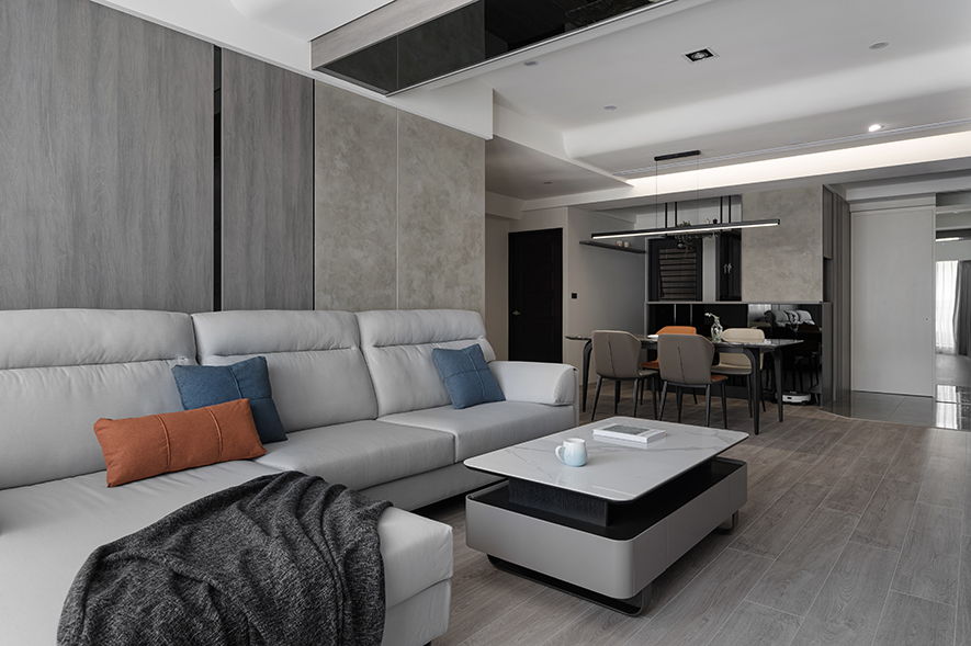 沉穩的冷調木紋沿周邊櫃體延展,順著其脈絡緩步前行,深淺交織的現代質感在行進間逐漸展開。當特殊塗料的獨特肌理與石材紋路在眼前鋪展,一種內斂而精緻的氣息便悄然瀰漫。踏入客廳的寬闊天地,弧形天花如雲朵般輕柔包覆,鏡面折射的光暈灑下點點星芒,而落地窗外傾瀉而入的日光,正溫柔地撫過每一處精心雕琢的細節,靜謐中透著家的溫暖歸屬。
