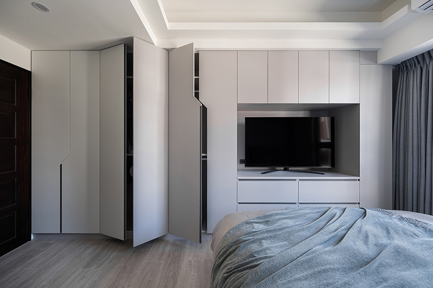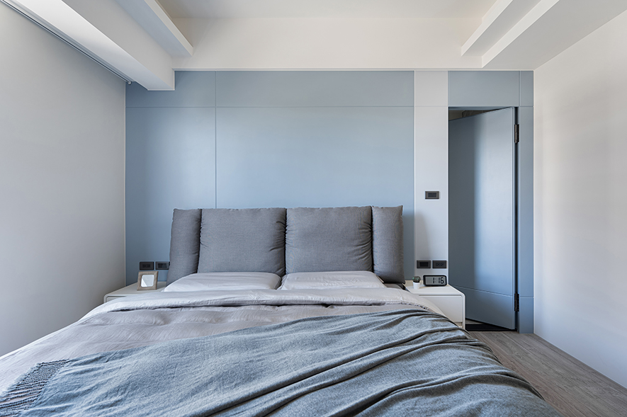 步入主臥,淺藍色調如清晨薄霧般溫柔包覆床頭背牆,隱藏門片的設計將浴室入口悄然融入其中,維持立面的純粹完整,與不對稱的幾何切割的純白儲物櫃門片展開清新對話,斜角線條的靈動設計打破傳統方正格局的同時保有簡潔美感,共同圍塑出簡約純淨的氛圍;天壁內嵌的柔和照明如月光般均勻灑落灰色織物床組,增添質樸氣息,窗畔垂落的深灰窗簾則為這方天地融入穩重感,在這以輕柔色調為主的私密領域中,交織和煦的安眠情境,為居者實現夢寐以求的恬淡臥房。